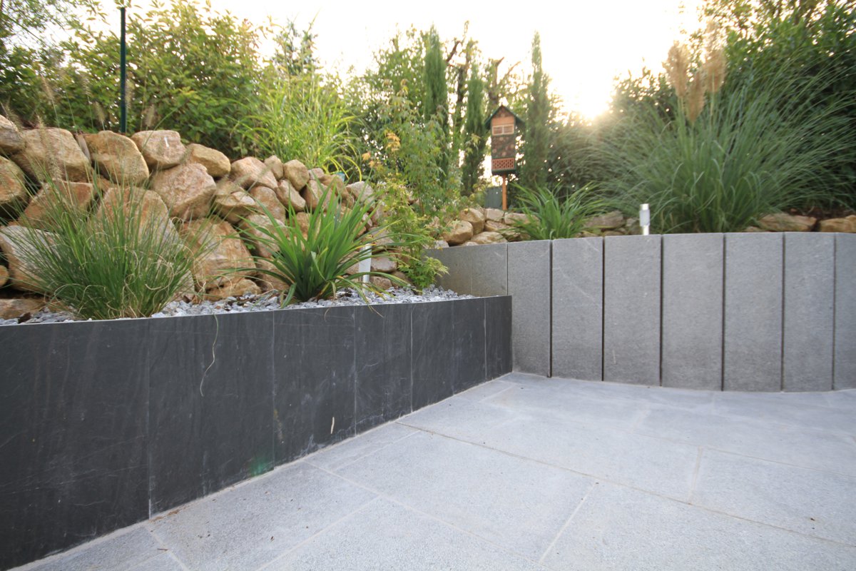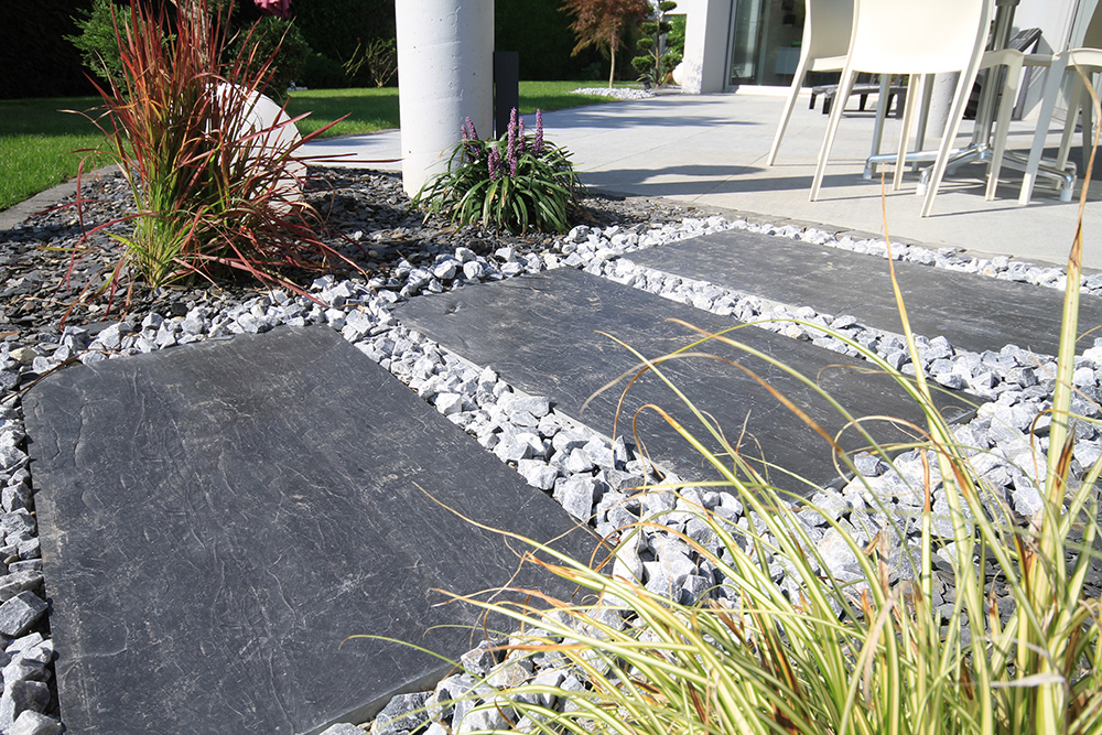 Gesägte Schieferpalisaden, die eine architektonische Geradlinigkeit im Garten vermittelt.