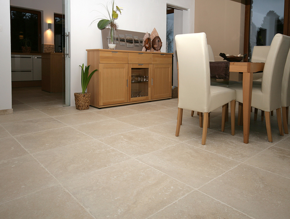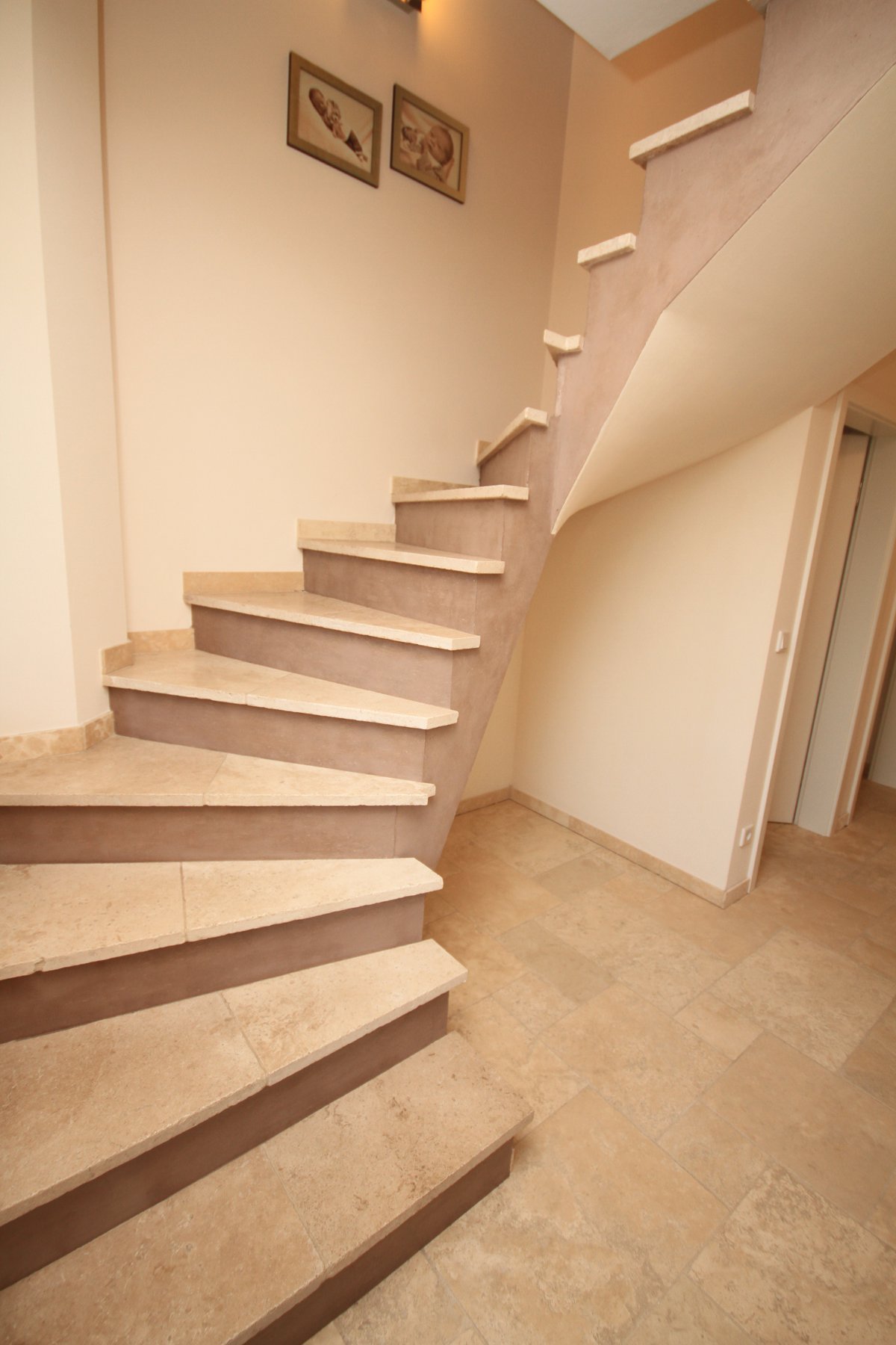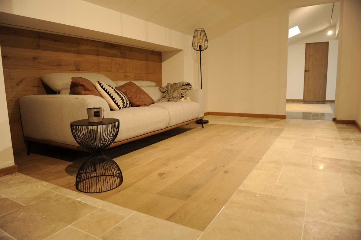 Plinthes en travertin, pour une finition propre de la surface du sol.