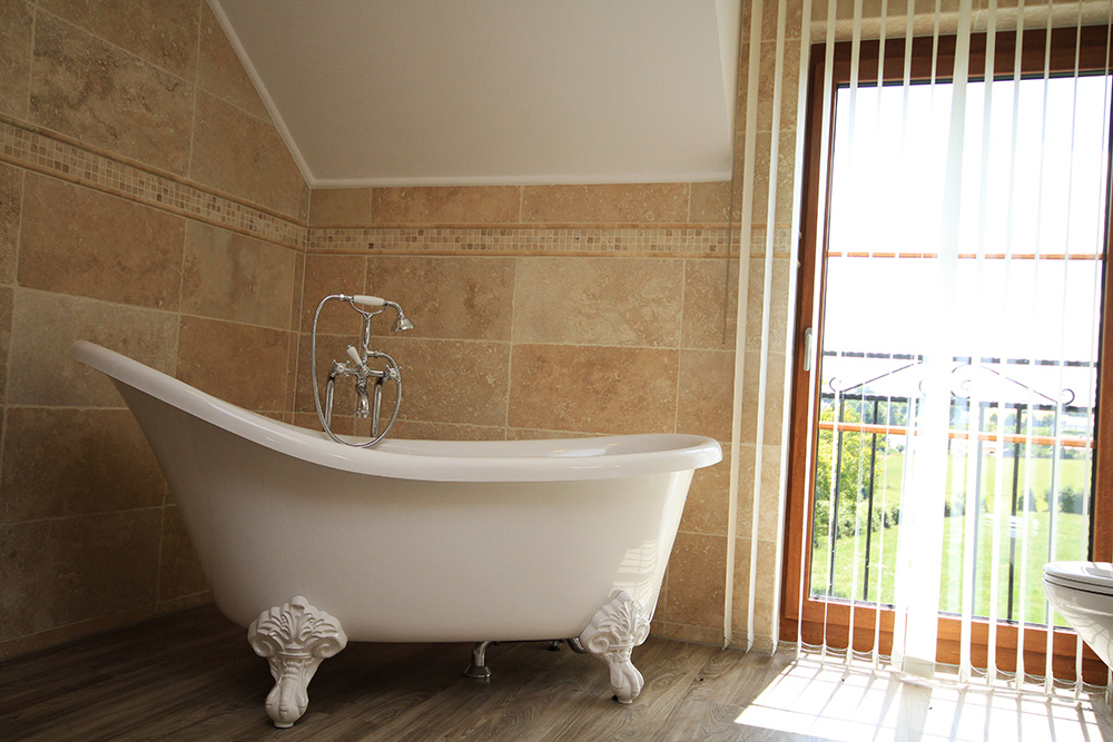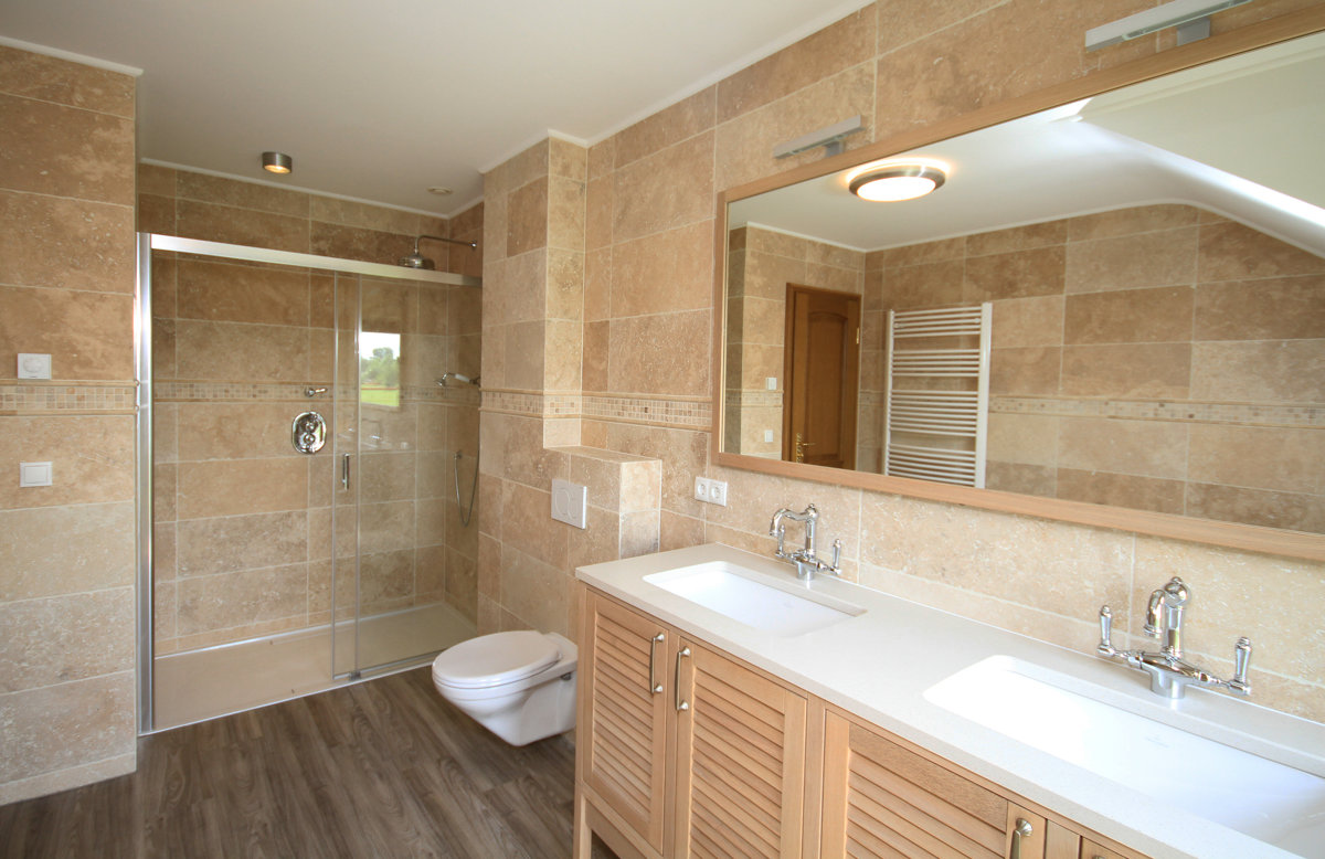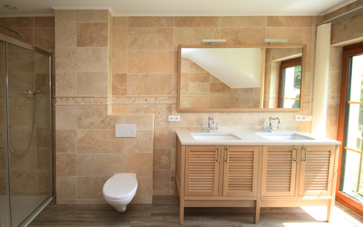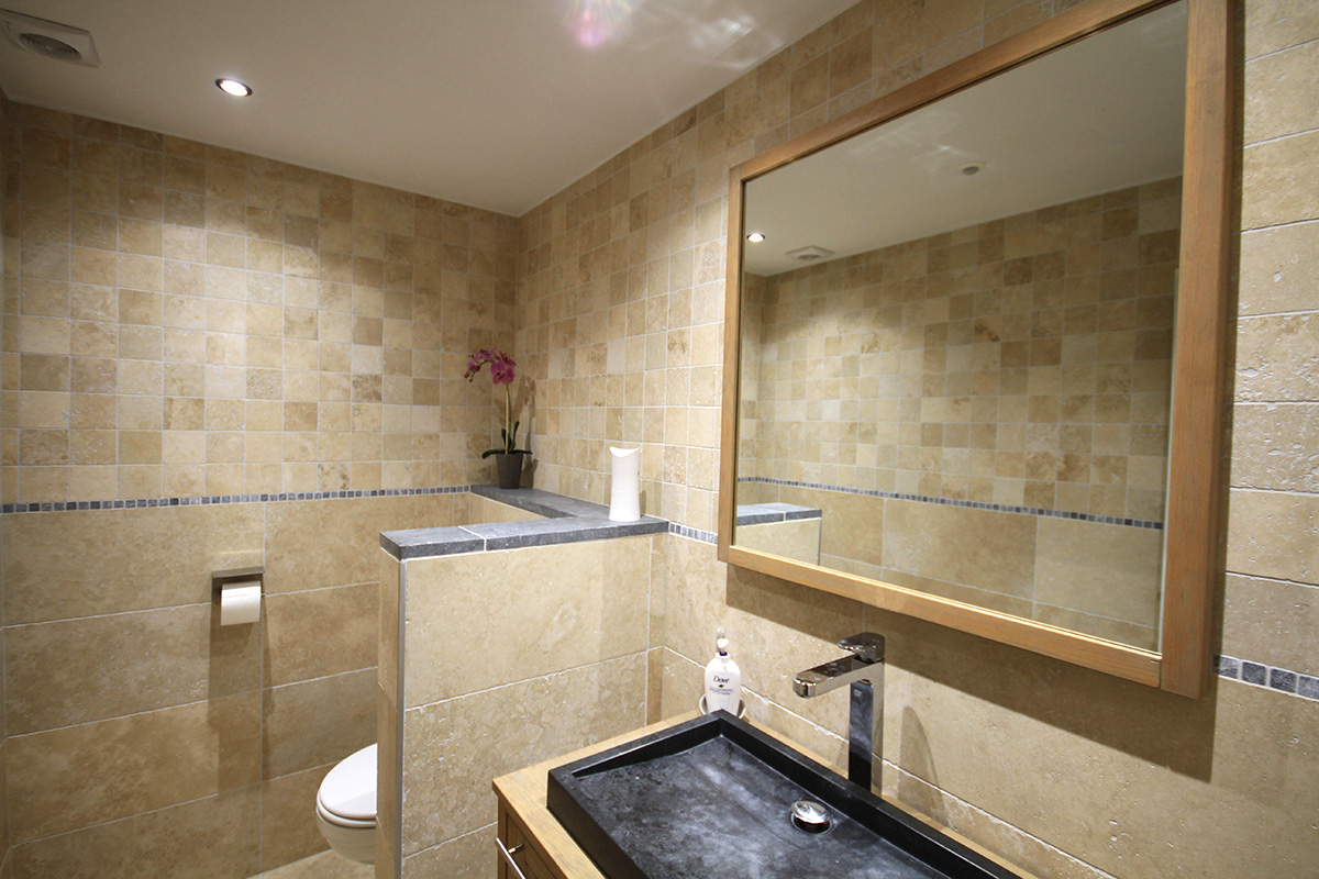 Plinthes en travertin, pour une finition propre de la surface du sol.