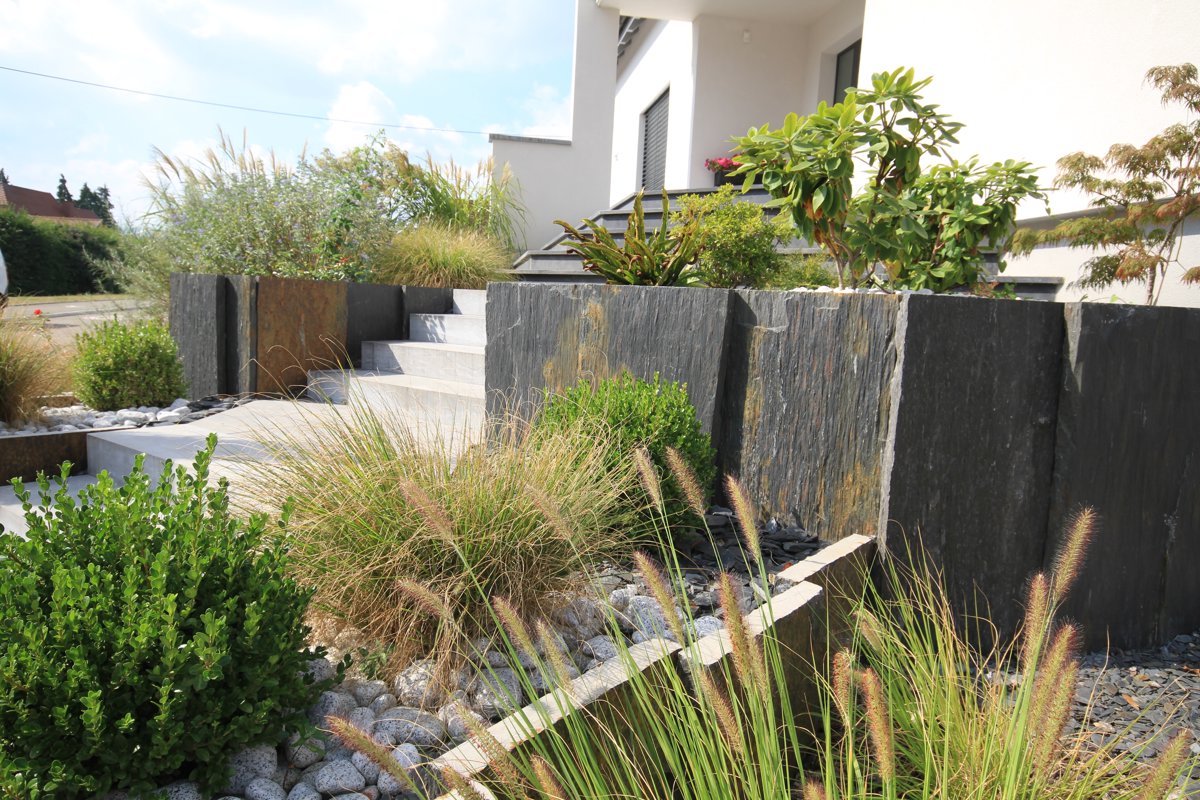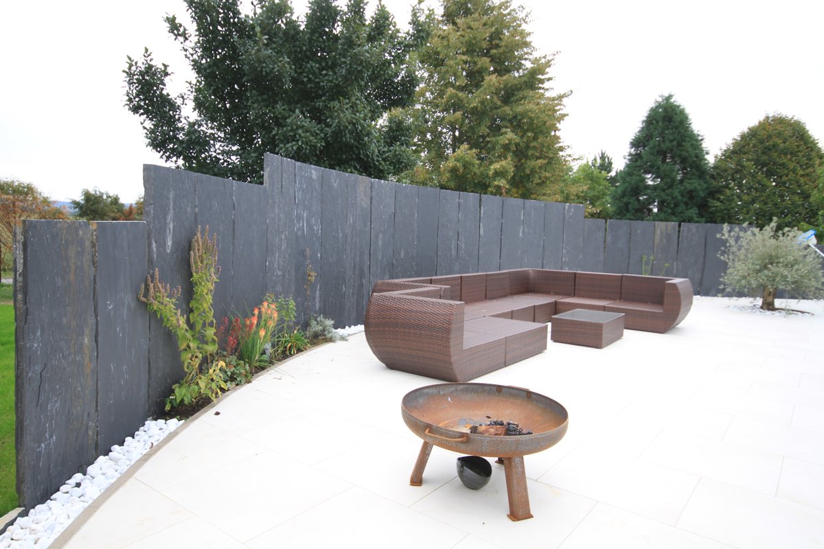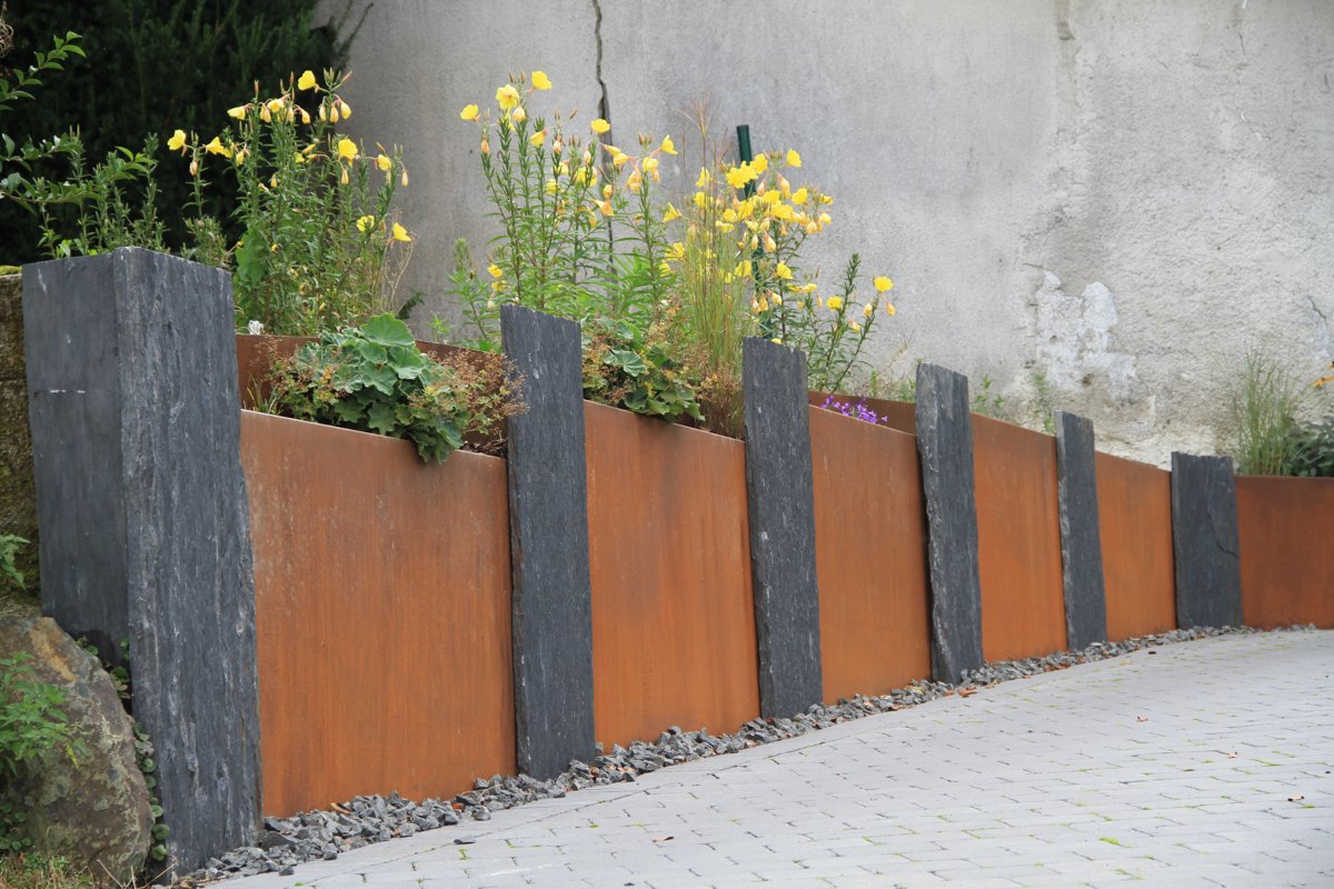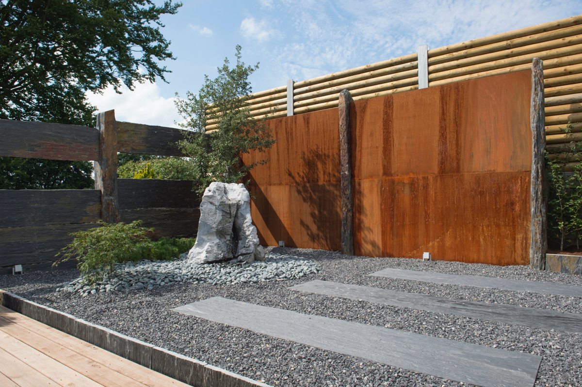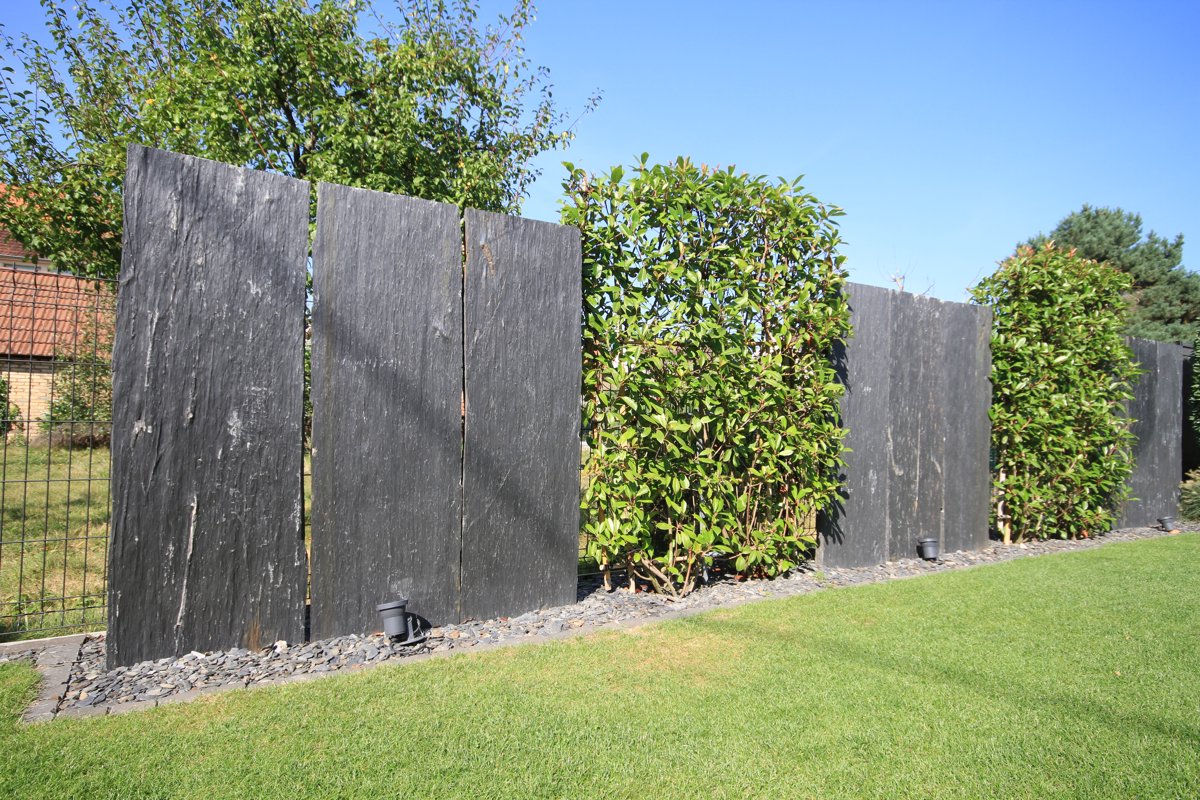 Leisteenpalissade: de leisteenlook met roestige delen heeft een heel natuurlijk effect en combineert prachtig met weelderige groene planten of onze cortenstalen producten.
